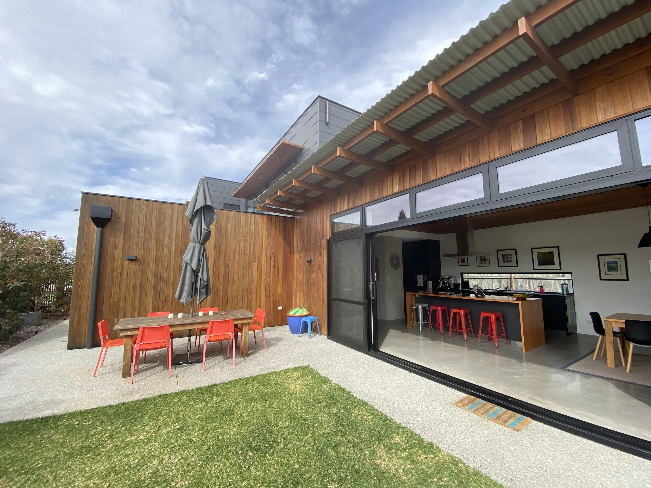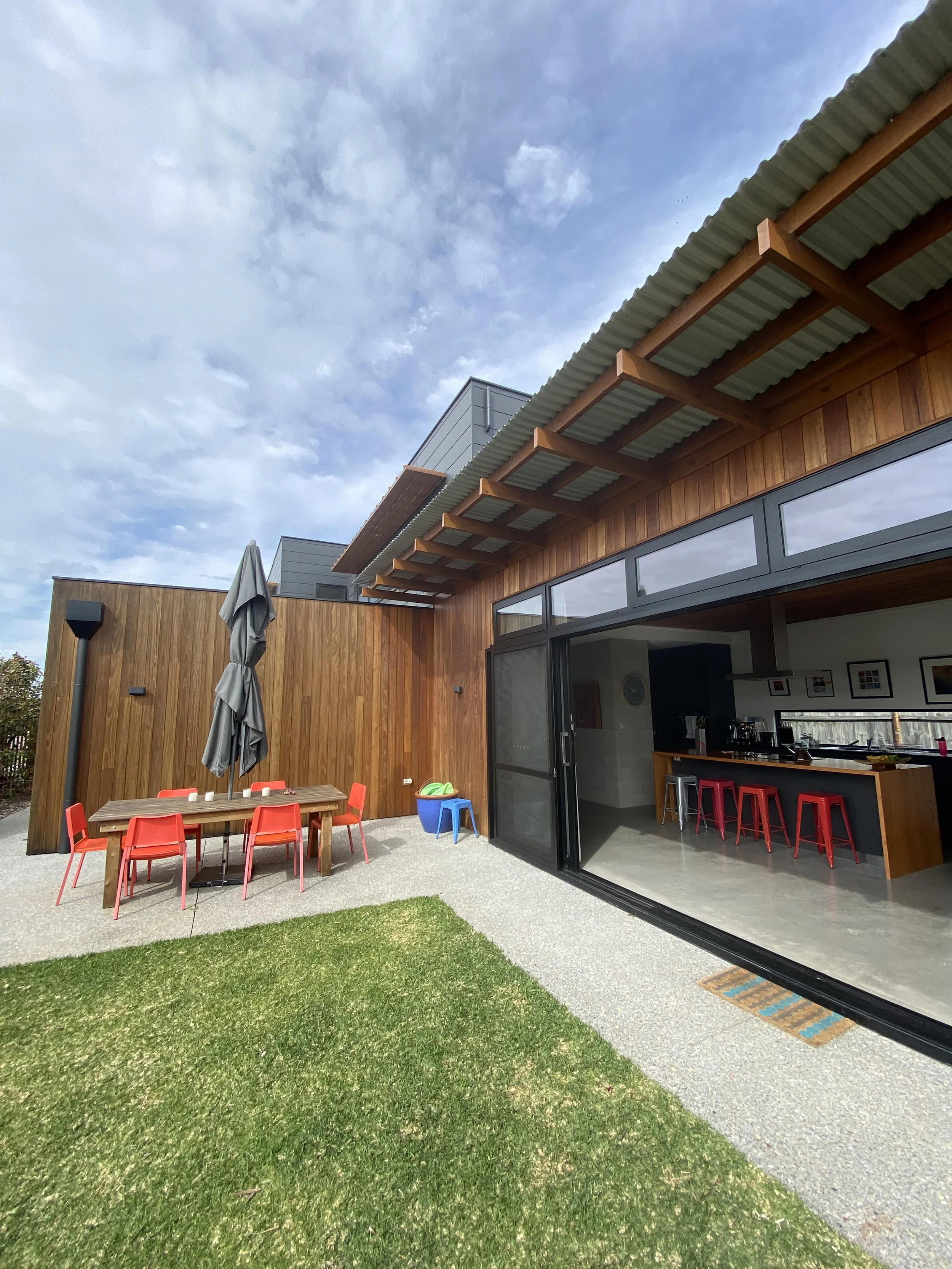 Burnished concrete floor to maximise passive solar absorption. Blackbutt and concrete blockwork.