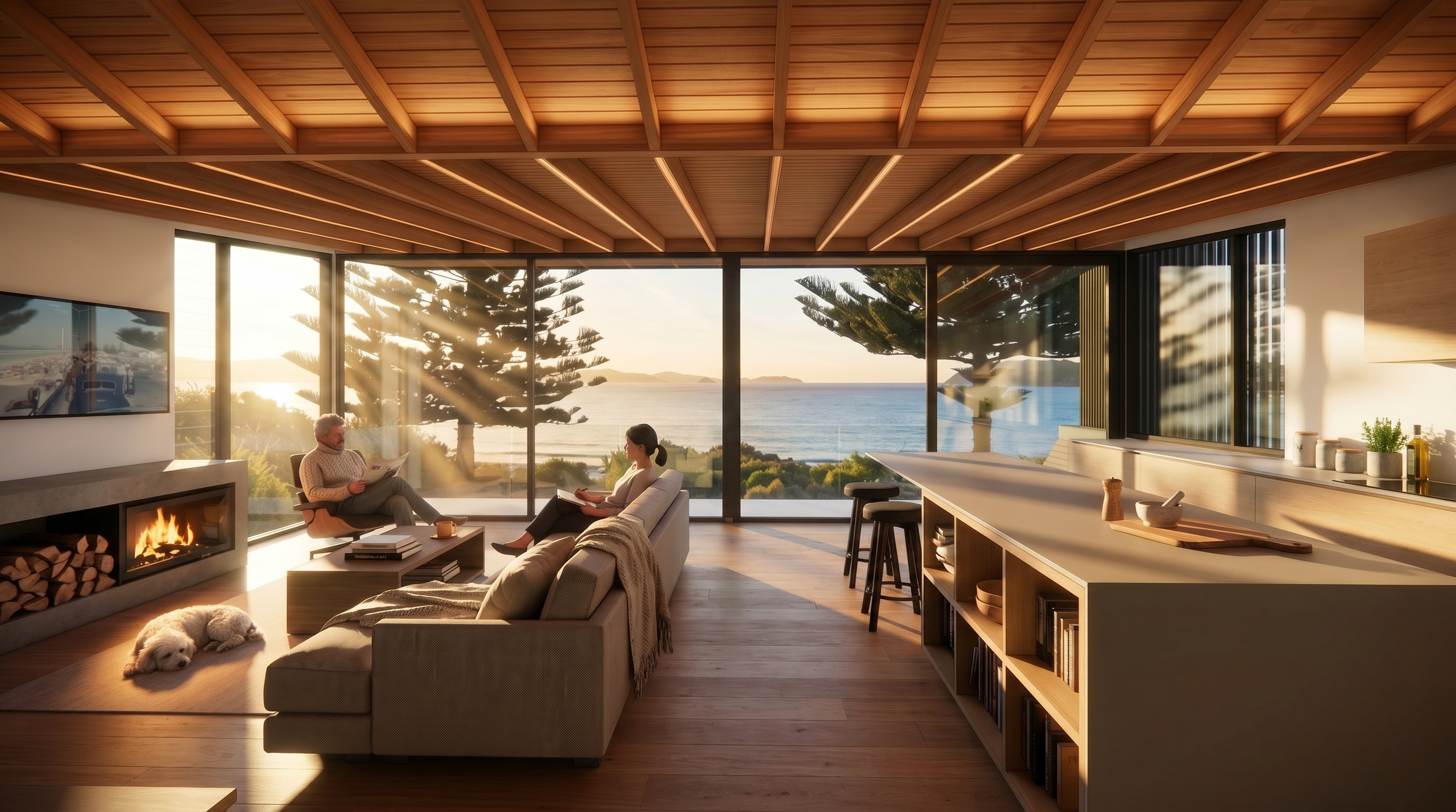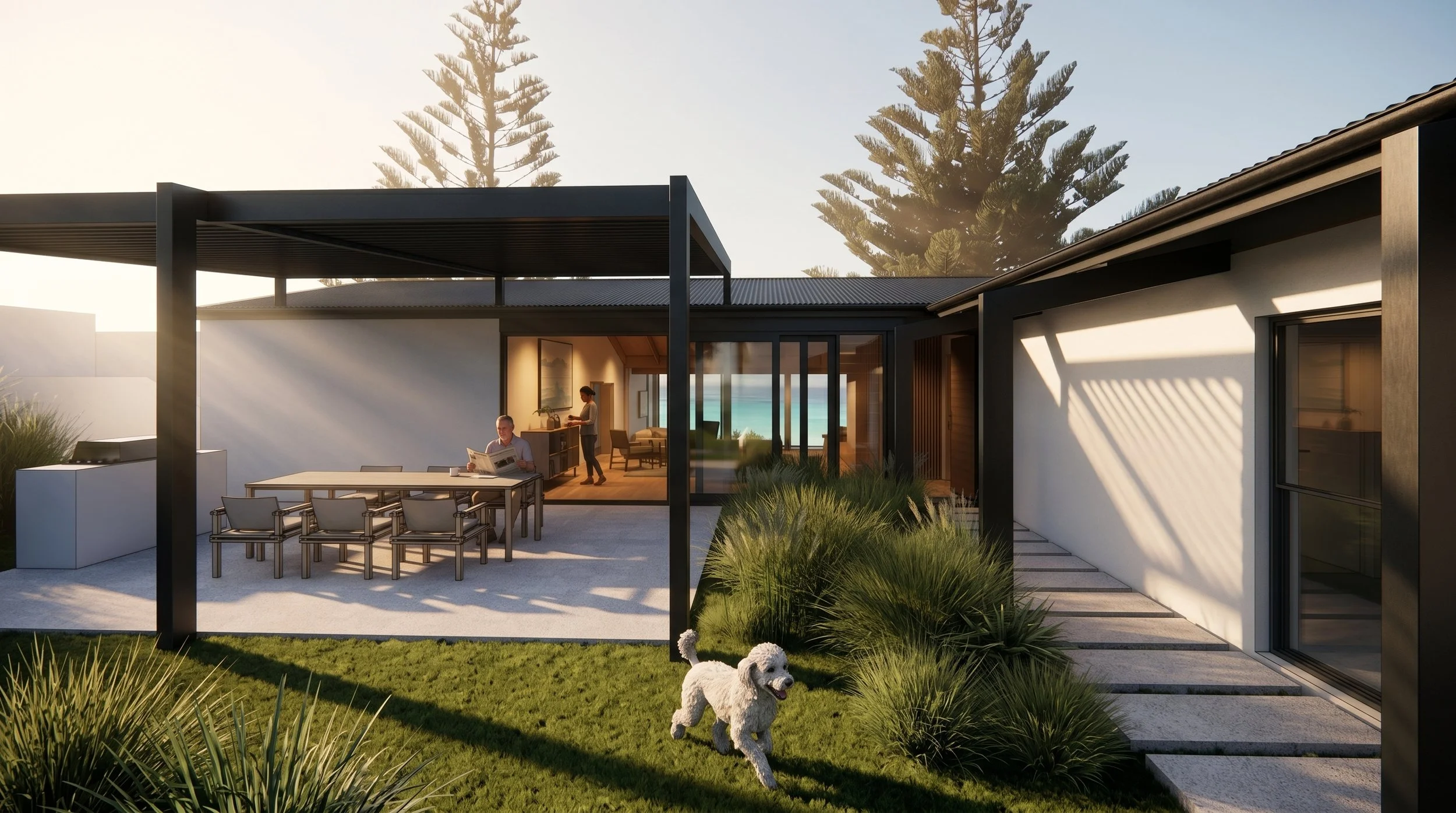 The home is now a study in dual-aspect living. To the east, the living area has been extended to capture 180-degree ocean views, creating a space where the indoors and the horizon feel like one. In contrast, the protected western alfresco area provides a sanctuary from the strong summer winds—the perfect setting for sunset hour, regardless of the coastal elements. The result is a home that doesn't just look out at the landscape, but breathes with it.